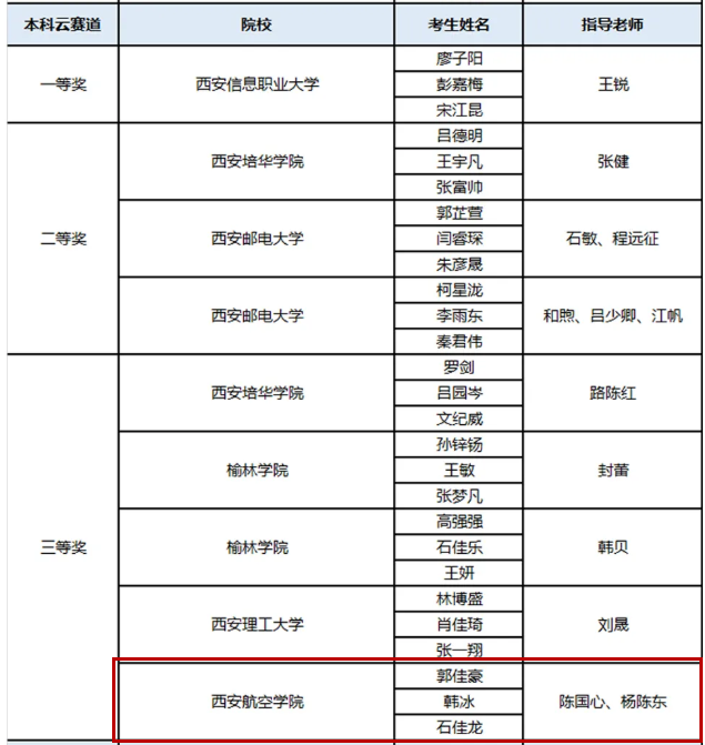 近日,由华为技术有限公司主办,宇信教育协办,中建信息赞助,软通动力、泰克教育及讯方技术协办的华为中国大学生ICT大赛2021实践赛陕西省决赛圆满落幕。本次比赛共有来自全省28所高校216名学生参加了总决赛。经过激烈比拼,开云官网由kaiyun开云官方陈国心、杨陈东老师指导的郭佳豪、韩冰、石佳龙学生团队,最终荣陕西赛区本科云赛道“三等奖”,王苗苗、单文娟老师指导的刘晓伊、杨雨、张轩睿学生团队荣获“优胜奖”。