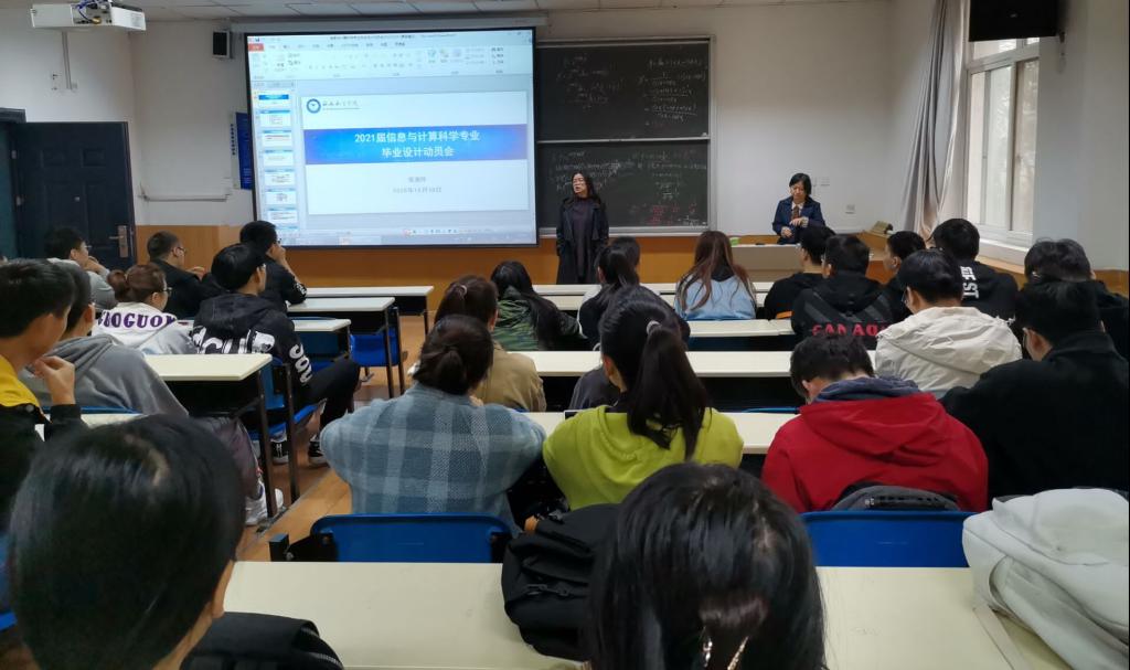 副院长丁琦为2017级信息与计算科学专业全体本科生做毕业设计动员。她指出,这次大会标志着大家进入大学最后的一个阶段,同学们在思想上要高度重视,在执行上要注意把握时间节点,在学术诚信上要有底线意识。她指出大学生涯是全方位提升升华的过程,最后的半年是用论文创新性解决问题的时期,而毕业设计(论文)环环相扣,任何一个环节都会对最终的结果产生影响。