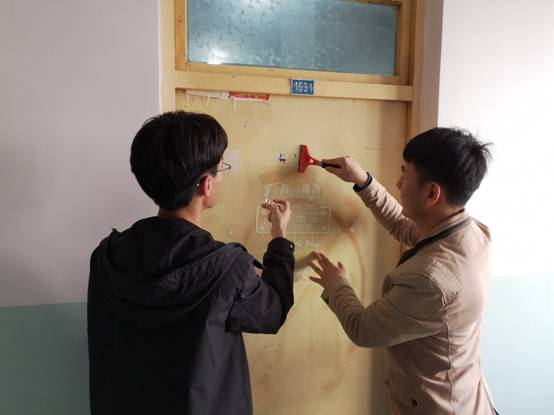 检查中,对每间宿舍逐一提出不合格项目,要求宿舍成员现场打扫;对难以打扫的项目,比如门上小广告、电扇拆卸、窗帘等现场指导方法,并做好安全防范措施;对个别脏乱差宿舍重点督查、反复检查、现场整改;辅导员、班主任多次全面检查宿舍,帮助学生解决残留问题。