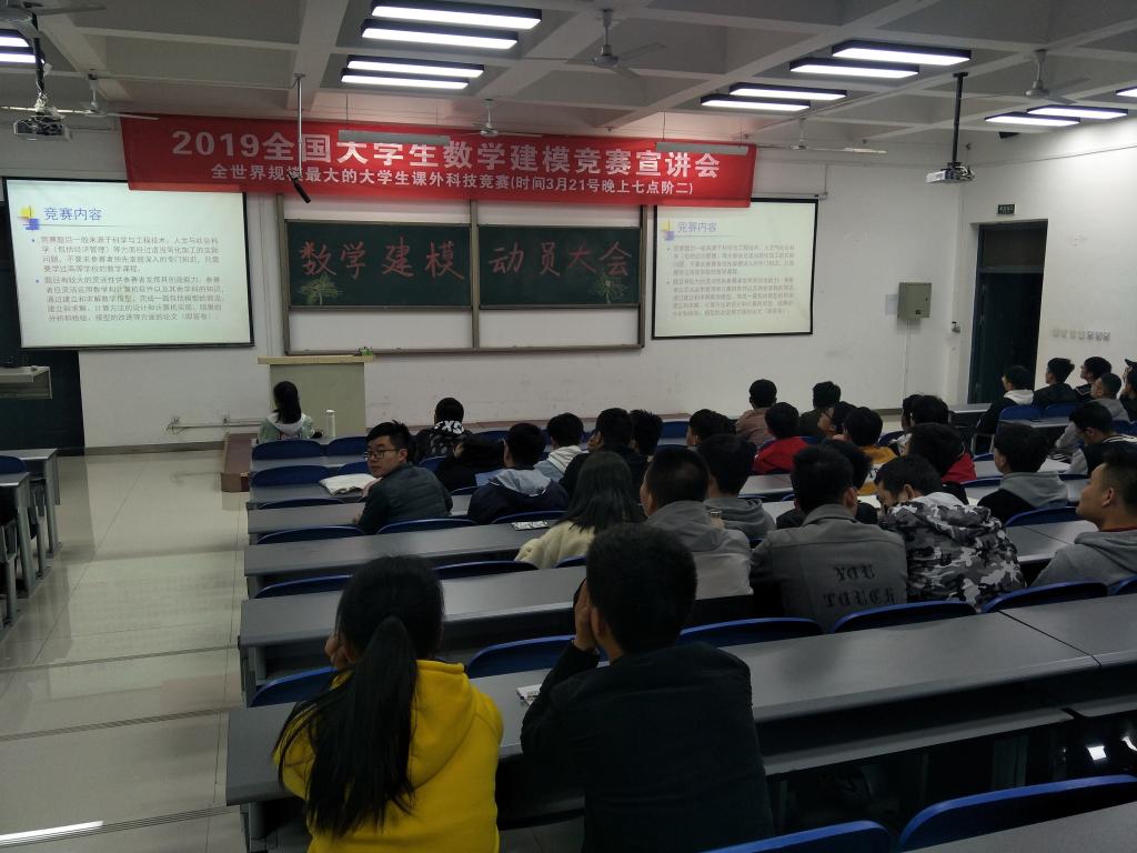 kaiyun开云官方团总支数学建模协会经过半个月左右的宣传和精心准备,2019年3月21号晚上7点,由kaiyun开云官方举办,数学建模协会承办的“2019年全国大学生数学建模竞赛宣讲会”在阶梯二顺利举行,本次宣讲会座由数学建模竞赛负责人张蒙老师主持。