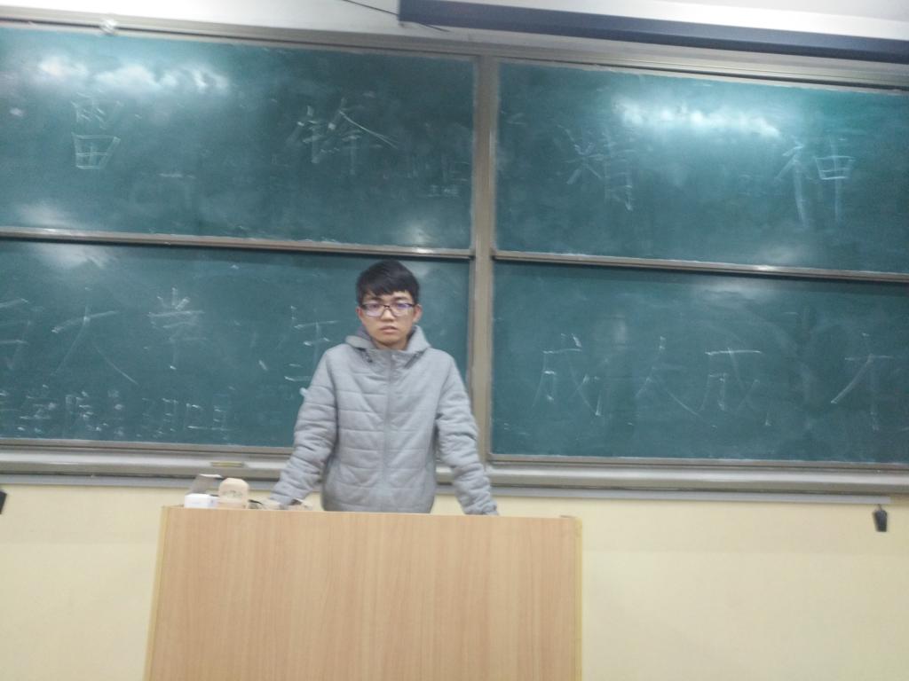 会议开始,班会负责人者亚宁讲述了此次班会开展的意义,以及雷锋的生平简史,接着我们通过一个有关雷锋的小视频来更深入的了解雷锋,了解雷锋精神,最后者亚宁从心理学角度对雷锋精神做了一个简要的分析,并要求大家要将心比心去体会雷锋丰富的内心世界,希望我们每个人都能发挥雷锋精神,本次班会圆满结束。