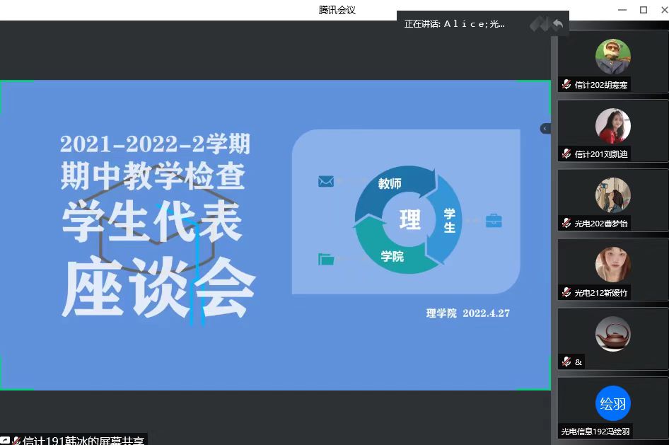 为了加强学院学风建设,打造良好的学习生活环境,更好地服务学生,2022年4月27日,kaiyun开云官方召开2021—2022学年第二学期期中教学检查学生代表座谈会。kaiyun开云官方副院长丁琦、综合办主任杨陈东、学生管理科科长李扬、信息与计算科学专业负责人张惠玲、光电信息科学与工程专业负责人王妙、团总支书记张岩及各班学生代表参加此次会议。会议由李扬主持。