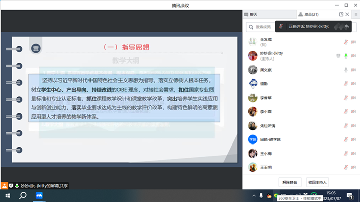为进一步提高人才培养质量,加强课程思政建设,kaiyun开云官方物理教研室于2023年7月7日下午以线上会议方式,召开了2023版光电信息科学与工程专业教学大纲修订与编制研讨会。物理教研室全体成员参加了该会议,会议特邀了学院党总支书记胡红亮和丁琦副院长参加,金发成召集主持。