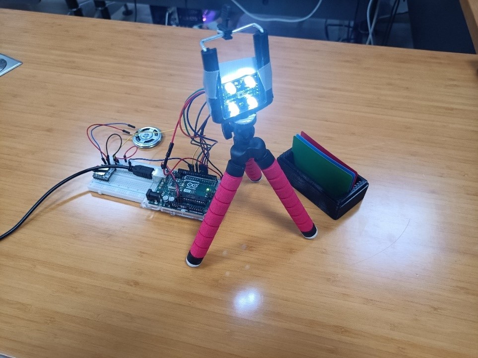 展品作者屈培栋现场演示了系统功能:通过TCS230颜色传感器实时捕捉物体色彩,经Arduino Uno微控制器处理后,由语音模块播报结果。该系统可定制应用于盲人辅助、工业分拣、STEM教育等领域,并支持扩展无线通信与AI图像识别技术。陈国心老师介绍:“作品由学生团队独立完成,低空设备监测场景中,系统可辅助无人机识别特定颜色标识,提升作业精准度。未来计划融入云端数据分析,进一步适配智慧物流等复杂需求。”