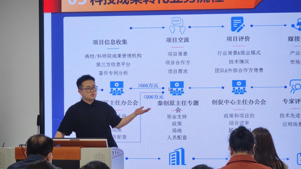 其次,魔茧科技有限公司赵谨严经理从秦创原的诞生背景、发展历程、建设成效、秦创原总窗口政策、科技成果转化项目的申报及业务流程等方面,为大家详细解读了秦创原创新驱动平台政策与科技成果转化流程。