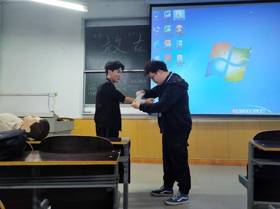 校红会救护部王晨向大家讲解了心肺复苏术的适用条件,详细介绍了心肺复苏术的操作流程及注意事项。模拟事故发生现场,通过现场急救演示,具体规范地向同学们分解心肺复苏的各项动作。同学们参与其中,切身感受真实所需力度。随后,救护部同学向大家讲解针对不同的伤势,绷带的正确使用方法,并给每位同学分发绷带,现场练习。同学们相互配合,练习手腕受伤后止血,按压及包扎方法。通过实践,同学们加深印象,以便及时、正确地进行急救。