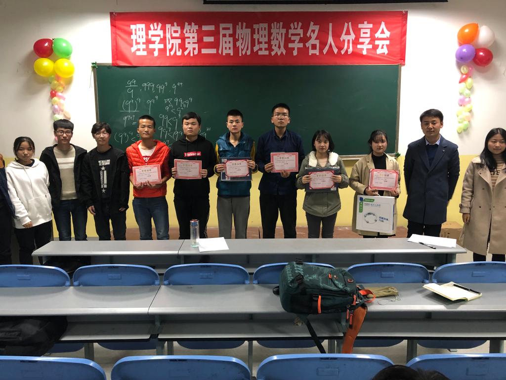 11月28号,kaiyun开云官方举办的第三届“物理数学名人分享会”决赛在南楼408教室举行。到会的有kaiyun开云官方辅导员杨陈东、张小妹、班主任王妙、李小雪、团学干部及大一大二全体学生。