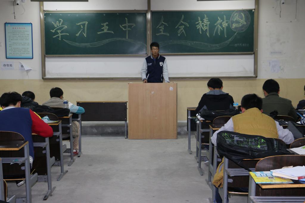 首先团总支副书记朱宗贵同学进行了简短的开场白,之后由团总支社团活动部部长李阳组织了全体同学对五中全会精神进行了具体的学习,重点学习了十三五期间需明显突破的十大领域,十三五规划的关键点。之后有社会活动部部长吴昊给大家带来关于五中全会内容的机智问答,同学们积极回答问题现场气氛活跃,最后由朱宗贵进行了这次关于十八届五中全会的内容总结。