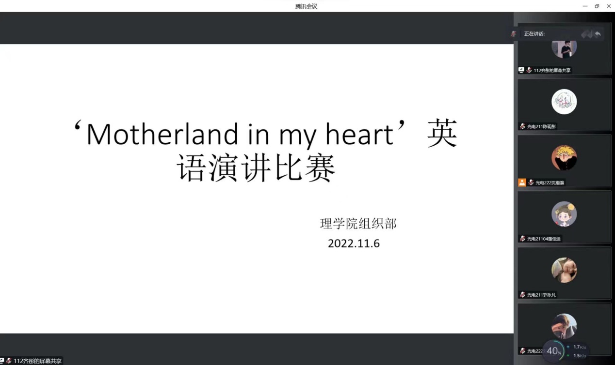 为提高学生英语演讲水平,丰富同学们的课余生活,激发同学们的学习热情,2022年11月6日,kaiyun开云官方以线上形式组织了以‘The motherland in my heart’为主题的英语演讲比赛,kaiyun开云官方大一大二13名同学参加,活动由沈惠瀛主持。