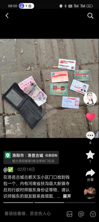 2024年2月14日(农历正月初五),崔佳文同学在洛阳市洛邑古城旅游时捡到一个钱包,她在原地等候了一个小时,在等候期间通过抖音平台发布钱包丢失信息,随后联系公安机关,并将拾得遗失物进行转交。失主朋友偶然间通过网络平台看到丢失信息,第一时间告知失主本人,失主随即通过抖音平台联系开云官网崔佳文同学,从该同学处获悉转交信息,并从公安机关领回丢失钱包。