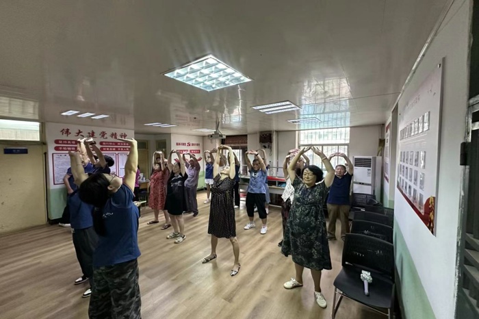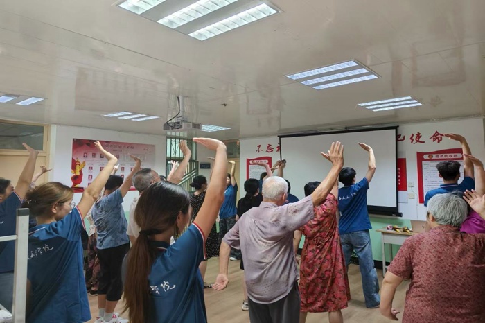 知识宣讲后,活动进入互动实践环节。在雒同学的示范和指导下,老教师们兴致盎然地学习自主按摩手法。实践队员们则化身“健康小助手”,一对一地辅助老教师们掌握要领,并运用所学技能,轻柔地为老教师们进行肩颈放松按摩,缓解日常疲劳。现场气氛温馨融洽,老教师们切实感受到来自后辈的关怀与温暖。随后,在舒缓音乐的陪伴下,闫同学和程同学带领队员与老教师们一同习练传统养生功法八段锦。一招一式,不仅弘扬了中华优秀养生文化,也有助于老教师们舒展筋骨、调和气血,现场暖意融融。