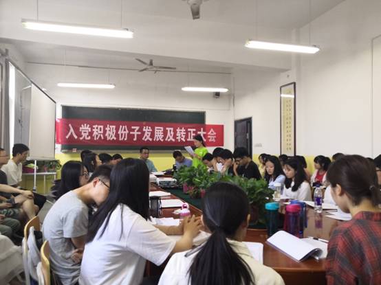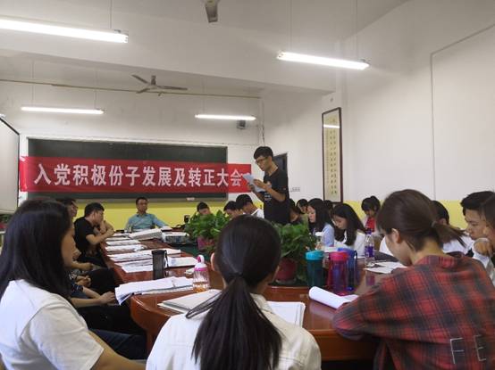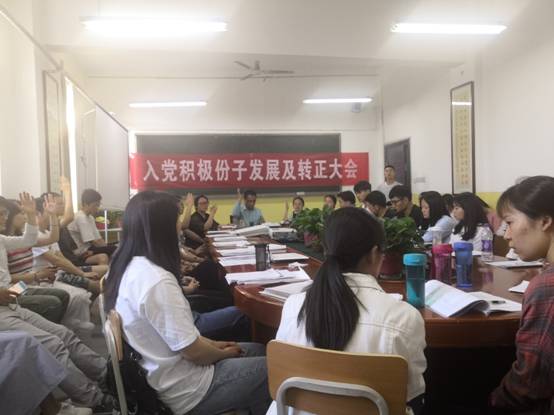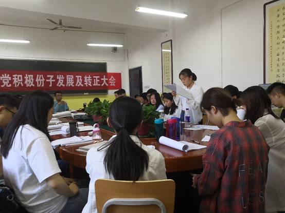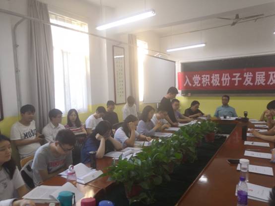 本次会议由学生党支部书记曹建波老师主持,会议开始,首先由曹建波老师宣布开会,汇报出席会议的正式党员,会议议题以及大会要求。之后11名入党积极分子宣读《入党志愿书》以及需要向党组织说明的其他问题,由入党介绍人介绍发展对象的主要情况和对其进行培养教育情况,并对其能否入党表明意见。