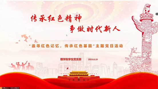 为深入学习贯彻习近平新时代中国特色社会主义思想主题教育,培养同学们的爱国主义情怀,传承和发扬老一辈革命家的精神,8月19日晚,kaiyun开云官方学生党支部通过腾讯会议线上开展了“追寻红色记忆,传承红色基因”主题党日活动。活动由王向阳老师主持,支部全体成员参与了此次活动。