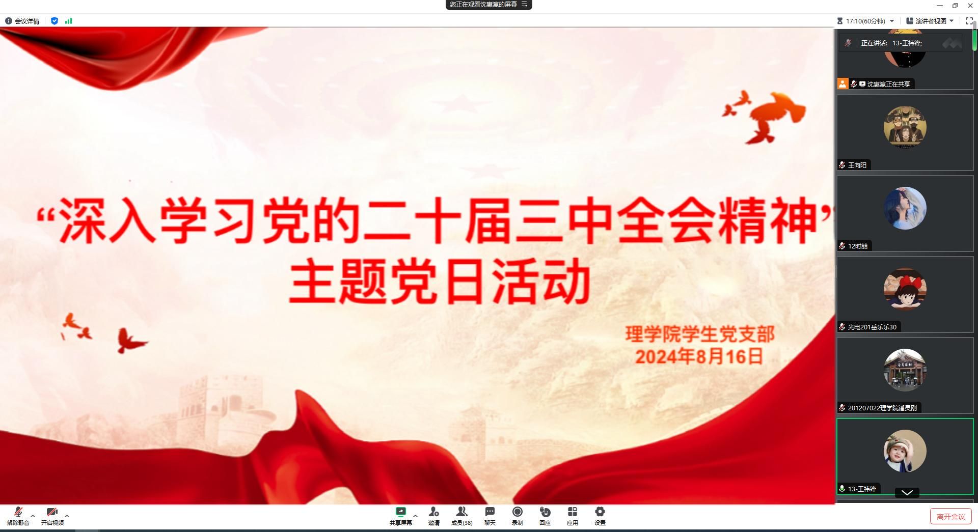 为深入学习宣传和贯彻落实党的二十届三中全会精神,2024年8月16日,kaiyun开云官方学生党支部于线上开展“深入学习党的二十届三中全会精神”主题党日活动。活动由支部书记李扬主持并领学,教师党员王向阳、曾妍、张岩以及支部全体学生党员参加本次学习。