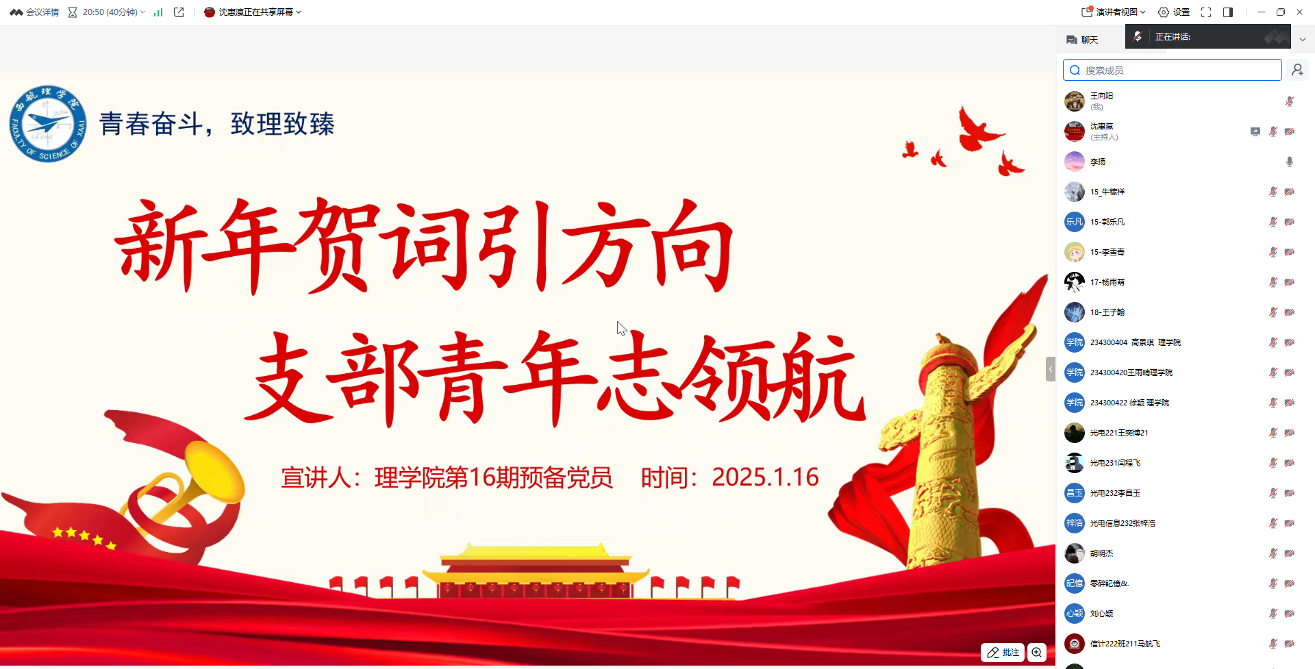 2025年1月16日kaiyun开云官方学生支部组织开展了以“新年贺词引方向,理院青年志领航”为主题的党日活动,学习习近平主席二〇二五年新年贺词,激励广大学生党员在新的一年里挺膺担当、奋发有为。支部全体党员参加,此次活动由组织委员王向阳老师主持。